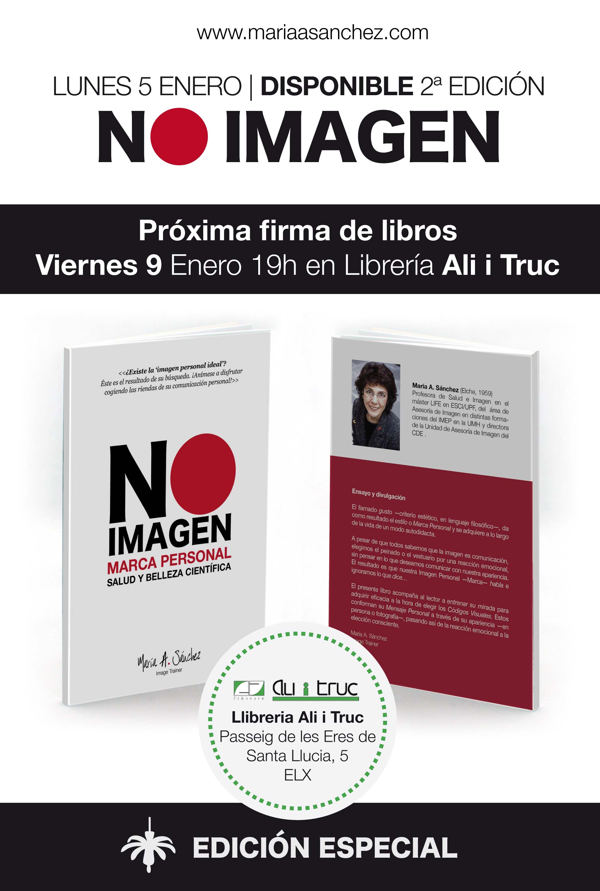 La experta en Imagen de Marca Personal, María A. Sánchez, firmará este viernes 9 de enero en la librería Ali i Truc a partir de las 19:00 horas, su libro “No Imagen”. Una breve guía para convertir el gusto estético en una saludable y eficaz Imagen de Marca Personal. En dicha publicación la autora ilicitana refleja la información y las estrategias que lleva más de 15 años impartiendo en sus conferencias, seminarios, talleres y consultas. Agotada la primera edición del libro, que se presentó el pasado viernes 2 de enero, la autora procederá mañana a firmar los ejemplares de la segunda.